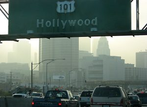 US Route 101 entering a smoggy downtown Los Angeles, CC BY-SA 3.0, via Wikimedia Commons