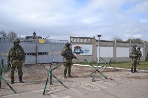 Russian soldiers blocking access to Ukrainian military base at Perevalne during the 2014 Crimean crisis, Anton Holoborodko (Антон Голобородько), CC BY-SA 3.0, via Wikimedia Commons