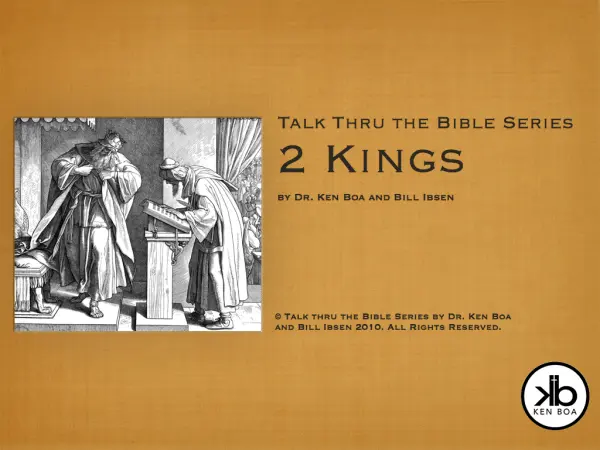 Need a teaching/learning tool on the book of 2 Kings to improve your biblical literacy or to teach to others? The Talk Thru the Bible series was designed to help pastors, teachers, and small group leaders learn or teach any book of the Bible in an easy way. Included is a package of high-quality visual presentation tools that you can use to teach just about any audience. Verbally or visually present an overview of the book using the included tools: a complete PowerPoint PC or Mac Keynote presentation, an MP3 audio file of Dr. Boa presenting the overview, the actual Word document script that Dr. Boa used to present the overview, plus a movie file of the animated PowerPoint/Keynote presentation given by Dr. Boa.