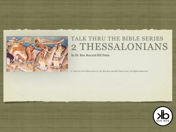 Need a teaching/learning tool on the book of 2 Thessalonians to improve your biblical literacy or to teach to others? The Talk Thru the Bible series was designed to help pastors, teachers, and small group leaders learn or teach any book of the Bible in an easy way. Included is a package of high-quality visual presentation tools that you can use to teach just about any audience. Verbally or visually present an overview of the book using the included tools: a complete PowerPoint PC or Mac Keynote presentation, an MP3 audio file of Dr. Boa presenting the overview, the actual Word document script that Dr. Boa used to present the overview, plus a movie file of the animated PowerPoint/Keynote presentation given by Dr. Boa.